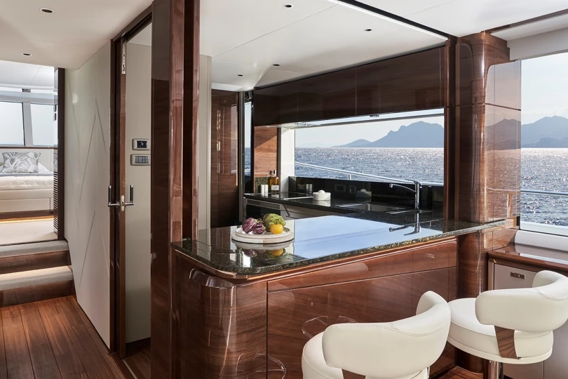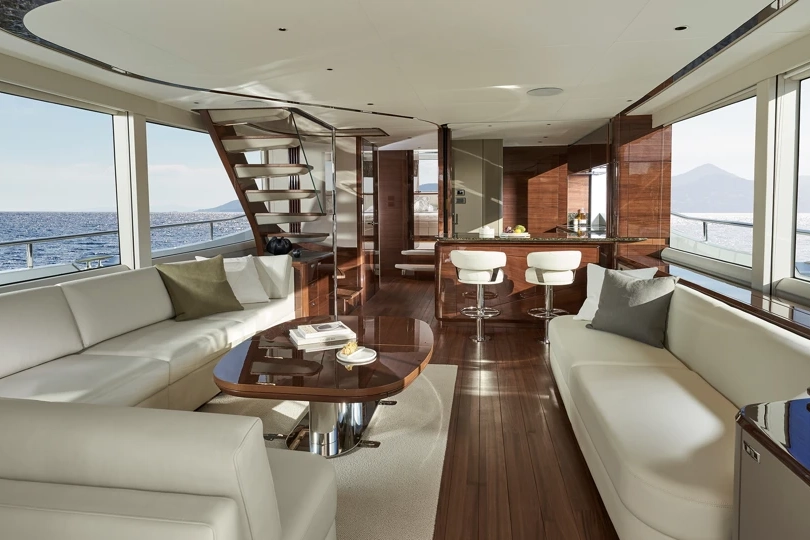 Princess X80 introduces the “Super Flybridge” concept, a yacht that redefines internal and external space within an 80-foot platform. Her extended flybridge structure creates an additional enclosed skylounge above the main deck, effectively adding a third level of interior living while preserving fluid exterior lines.The upper deck can be configured as a climate-controlled skylounge or open lounge terrace, offering panoramic views and flexible use. Below, the main deck is arranged around openness and light, with expansive glazing and sliding doors that integrate cockpit and salon into a continuous environment.A defining feature is the option for a main-deck owner’s stateroom, delivering direct sea views and enhanced privacy. Alternatively, a four-cabin lower-deck layout accommodates up to eight guests. Dedicated crew quarters aft support extended cruising autonomy.Constructed using advanced resin-infused composite technology, the X80 balances structural rigidity with optimized weight distribution. Twin MAN V12 propulsion systems provide confident long-range cruising performance and stable offshore capability.Princess X80 stands as a crossover between flybridge yacht and superyacht architecture, defined by scale, flexibility, and refined control.