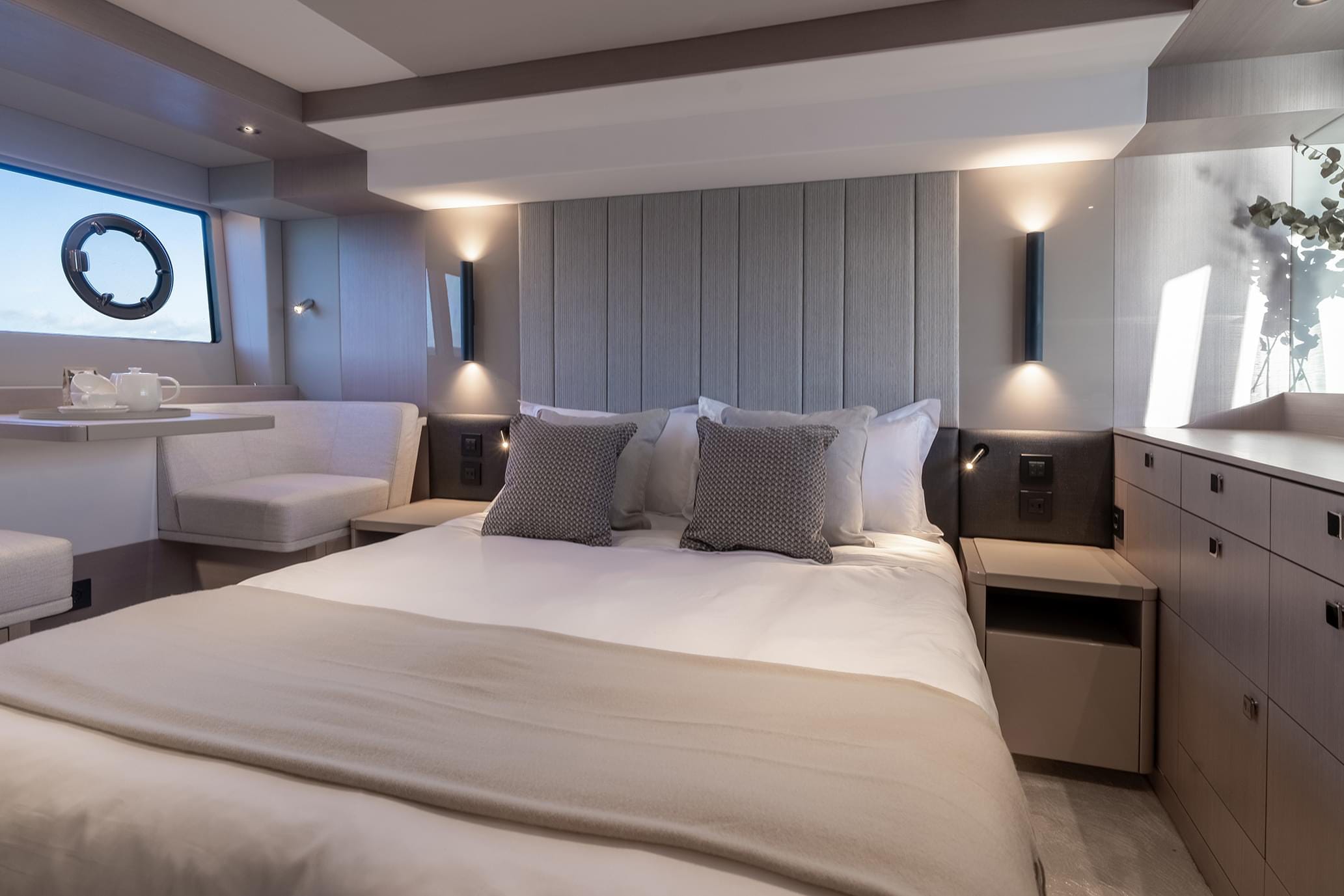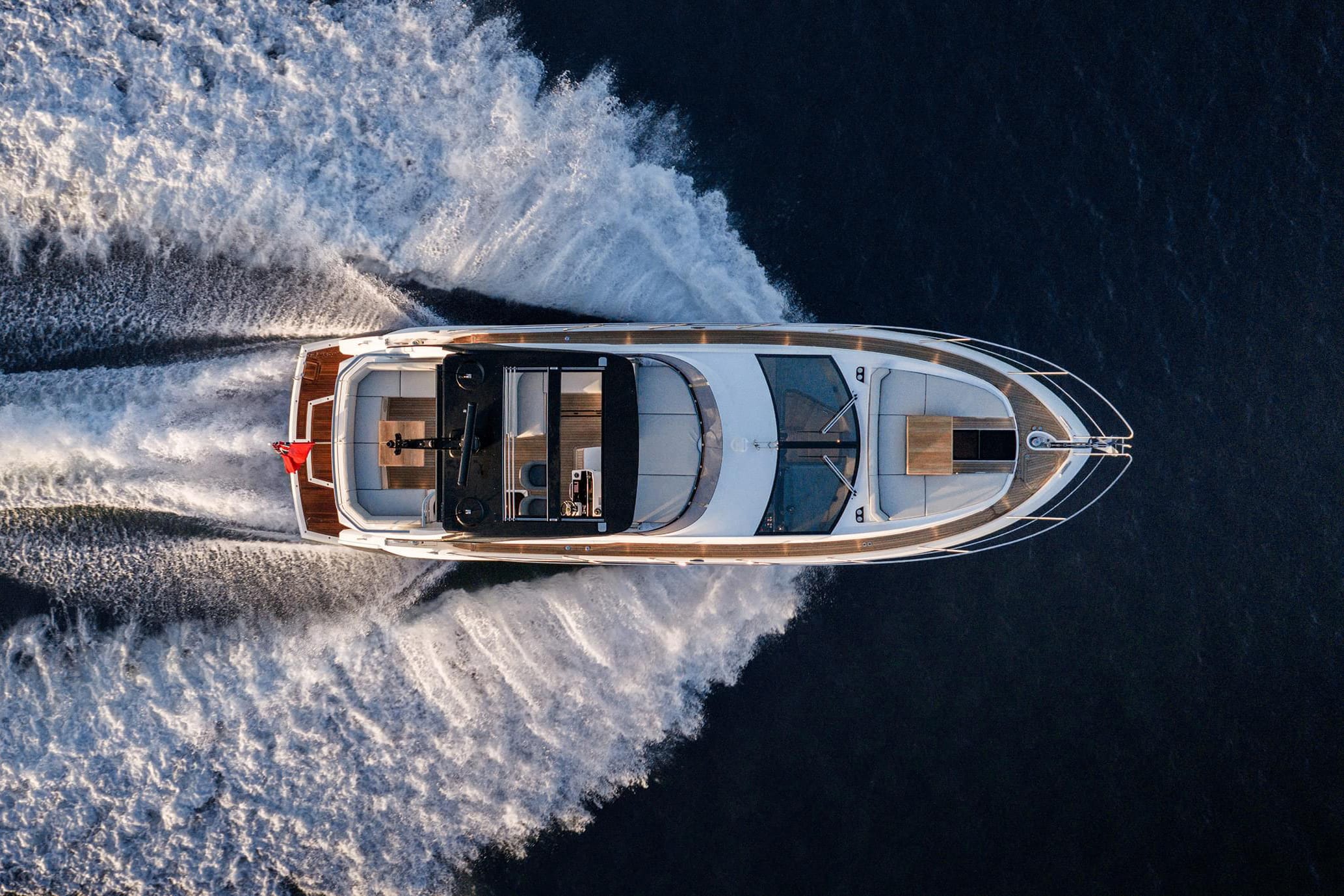 The Manhattan 56 advances the flybridge concept through measured design evolution and refined spatial planning. At just over 17 metres, she combines strong exterior lines with expanded glazing and carefully considered proportions, delivering both presence and practical usability.The main deck is conceived as an integrated social platform. Galley aft configuration enhances connection to the cockpit, enabling seamless indoor–outdoor interaction. Large sliding doors and opening windows amplify ventilation and natural light, reinforcing a sense of openness throughout the saloon.Above, the flybridge offers a well-balanced arrangement of helm, dining, and lounging zones, structured for both command and relaxation. Circulation is intuitive, with clear separation between operational and guest areas.Below deck, accommodation for six guests across three cabins is organised around comfort and privacy. The full-beam master benefits from generous hull glazing, while forward VIP and twin guest cabins complete a practical cruising layout.Performance remains central to the Manhattan identity. Responsive handling, stable planing behaviour, and efficient cruising speeds make her equally suited to extended coastal passages or fast inter-harbour transitions.