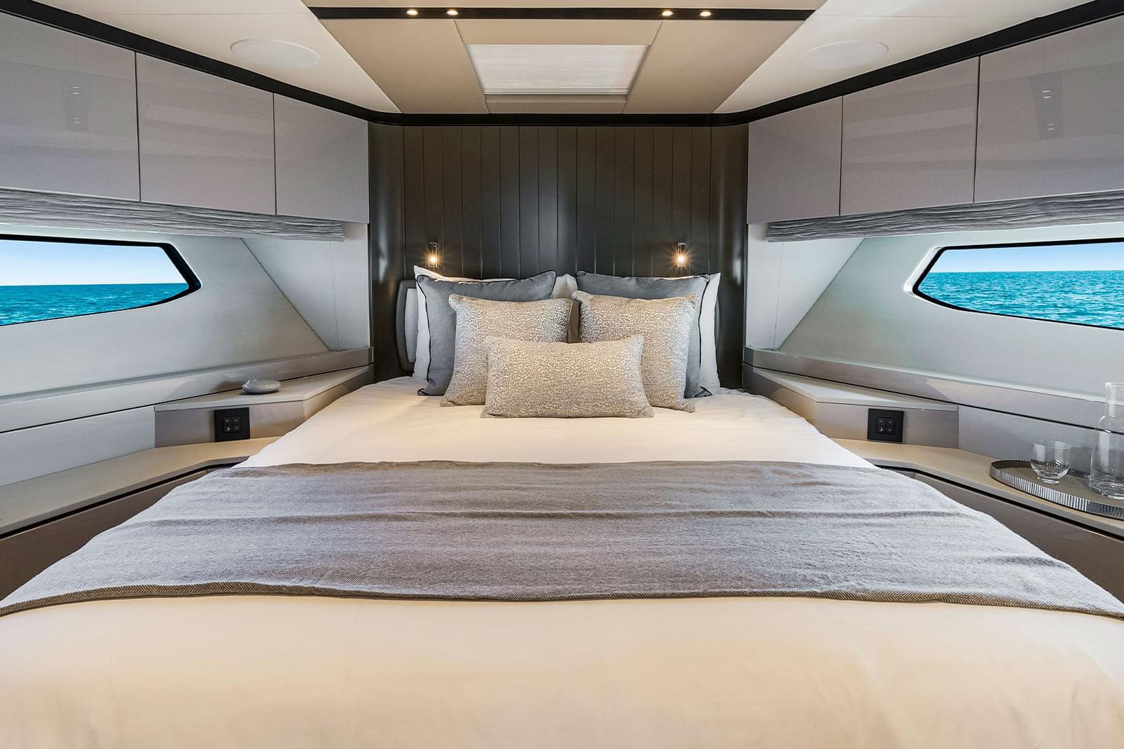 The Manhattan 68 represents a confident evolution of Sunseeker’s flybridge platform, combining muscular exterior styling with expanded interior architecture. At over 21 metres in length, she offers a strong, balanced profile defined by sweeping glazing and structured deck geometry. The main deck is conceived around openness and functionality. Aft-galley configuration enhances connection to the cockpit, creating a unified entertaining zone from interior salon to exterior dining area. Full-height glazing and sliding doors maximise natural light, while carefully proportioned furnishings preserve circulation and sightlines. The flybridge delivers a comprehensive leisure environment, with generous seating, dining space, wet bar and a commanding helm position. The arrangement is designed for both operational clarity and guest comfort. Below deck, accommodation for up to eight guests is arranged across four cabins. The full-beam master suite utilises the yacht’s beam for increased volume and hull glazing, while forward VIP and additional guest cabins ensure versatility for extended cruising. Twin MAN diesel engines provide strong planing performance and responsive handling. The hull form is engineered for stability at cruising speeds while maintaining efficiency across coastal and offshore passages.