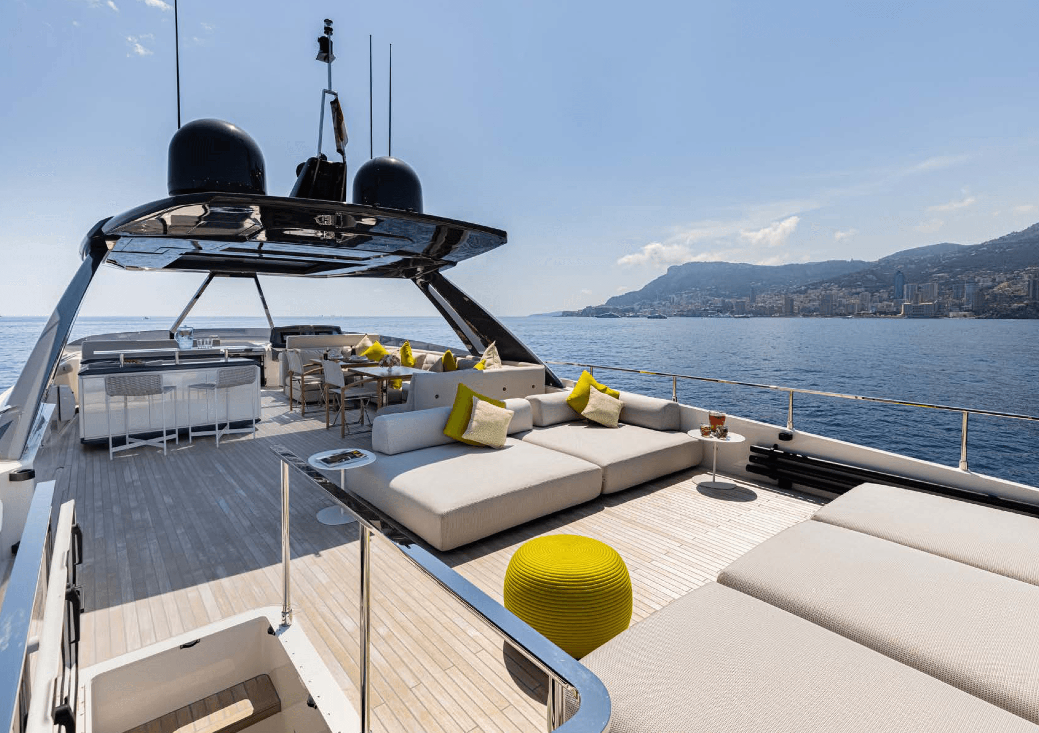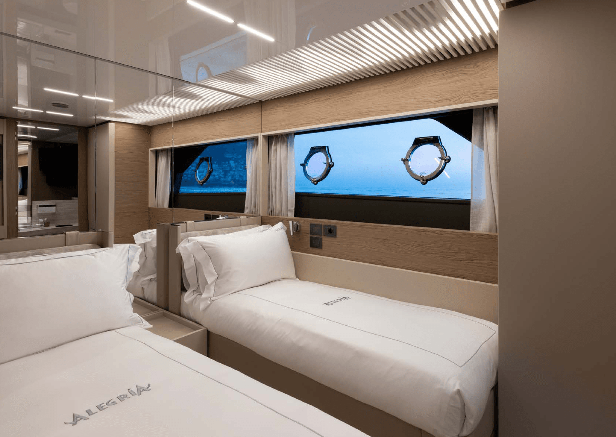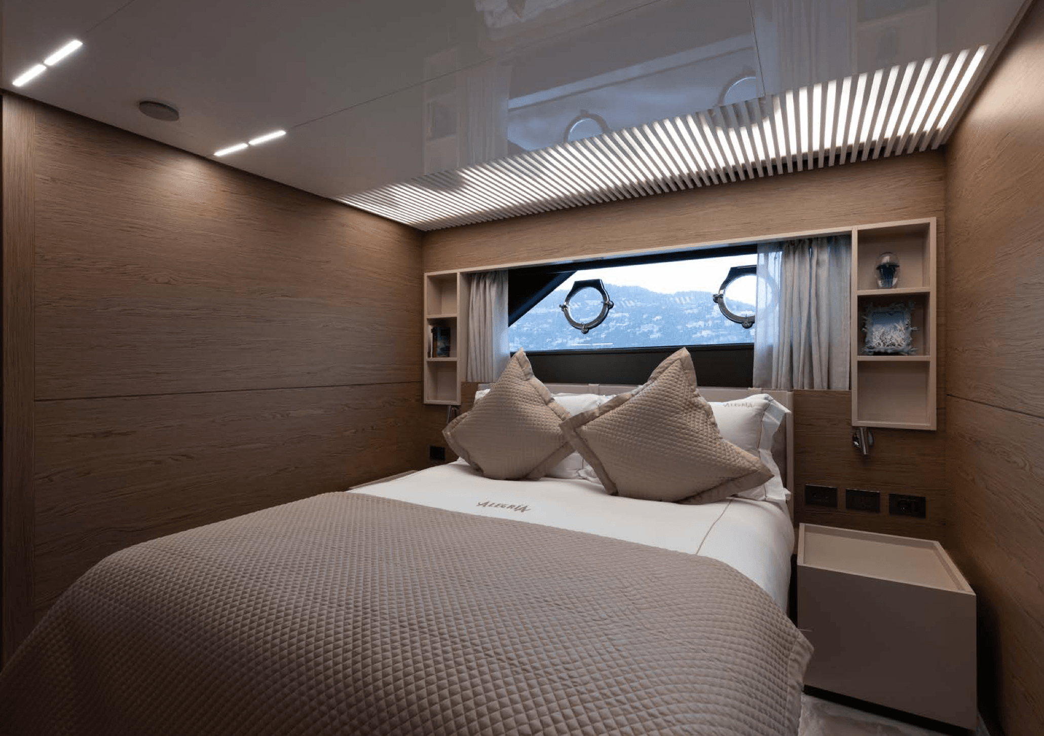 The 28.18 m Ferretti motor yacht ALEGRIA II is a contemporary yacht featuring a stunning sundeck and easy access to a variety of water toys from the swim platform. Outdoor spaces offer multiple sunbathing and alfresco dining options, including daybeds and a bar on the sundeck for ultimate relaxation. Designed by Zuccon International Project, the interiors are stylish and light, with a palette of whites, soft greens, greys, and light browns. ALEGRIA II accommodates eight guests in four cabins, a main deck master, a VIP suite, a double, and a twin, served by a crew of four.